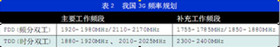 2002年信息產業部發布了我國3G頻率規劃,如表2。