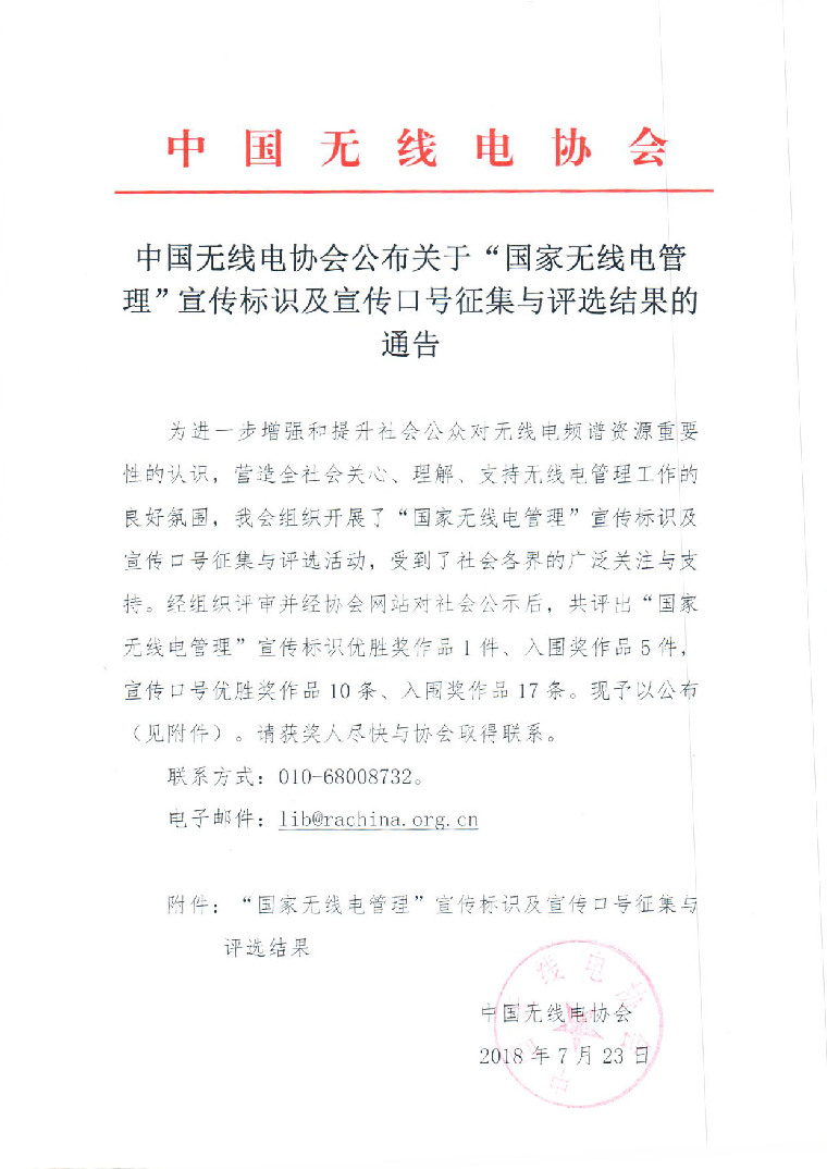 中國無線電協會公布關于“國家無線電管理”宣傳標識及宣傳口號征集與評選結果的通告