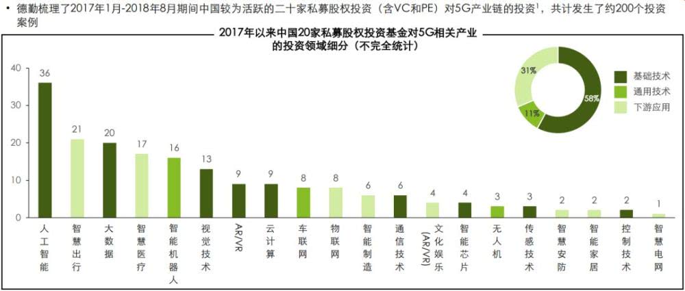中國私募股權投資基金對5G相關產業的投資以基礎技術為主,其次是下游應用。人工智能、大數據、視覺技術是基礎技術的投資熱點,智慧出行和智慧醫療是下游應用的投資熱點。