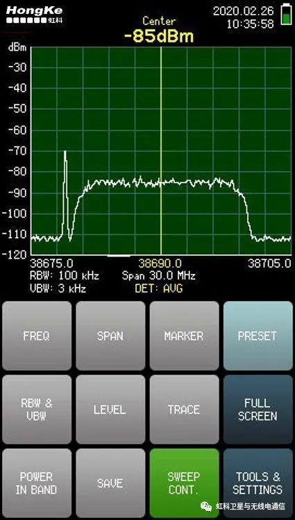 ● 記錄頻譜儀上顯示的占信號99%功率的帶寬,或使用虹科手持式頻譜分析儀的POWER IN BAND功能,直接觀察99%功率所占帶寬。