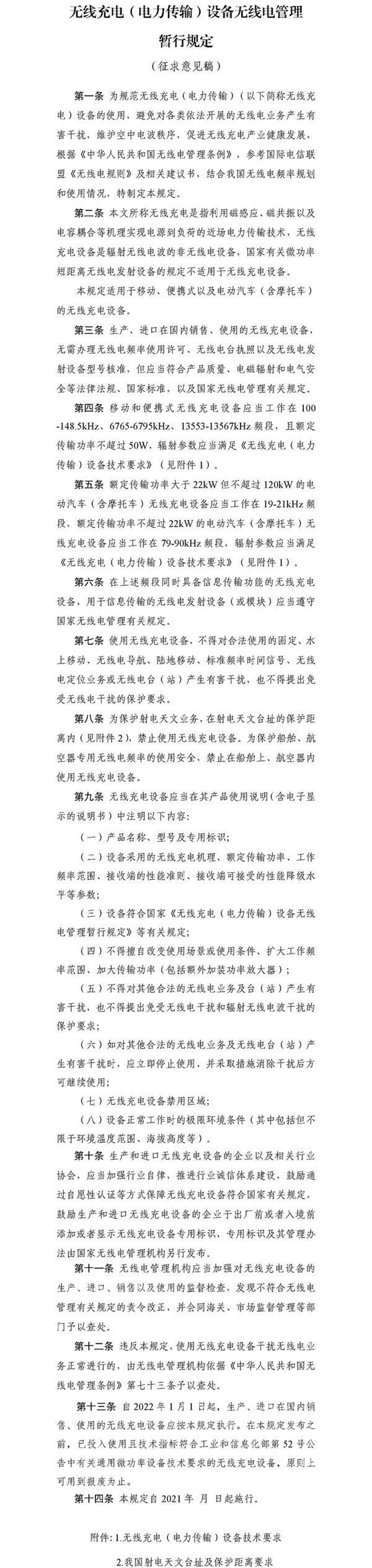 附件:《無線充電(電力傳輸)設備無線電管理暫行規定(征求意見稿)》