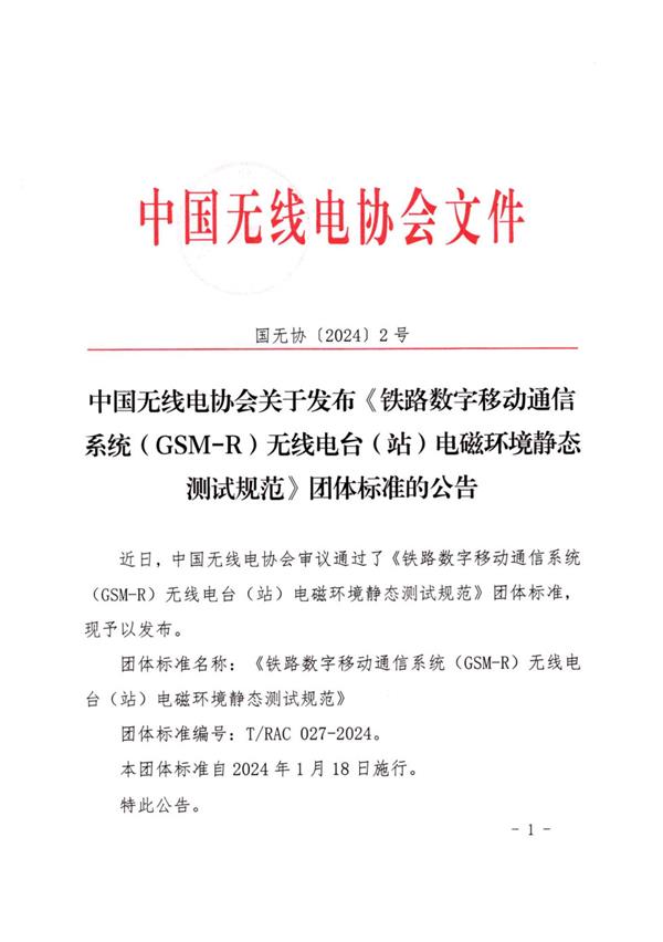 中國無線電協(xié)會關(guān)于發(fā)布《鐵路數(shù)字移動通信系統(tǒng)(GSM-R)無線電臺(站)電磁環(huán)境靜態(tài)測試規(guī)范》團(tuán)體標(biāo)準(zhǔn)的公告