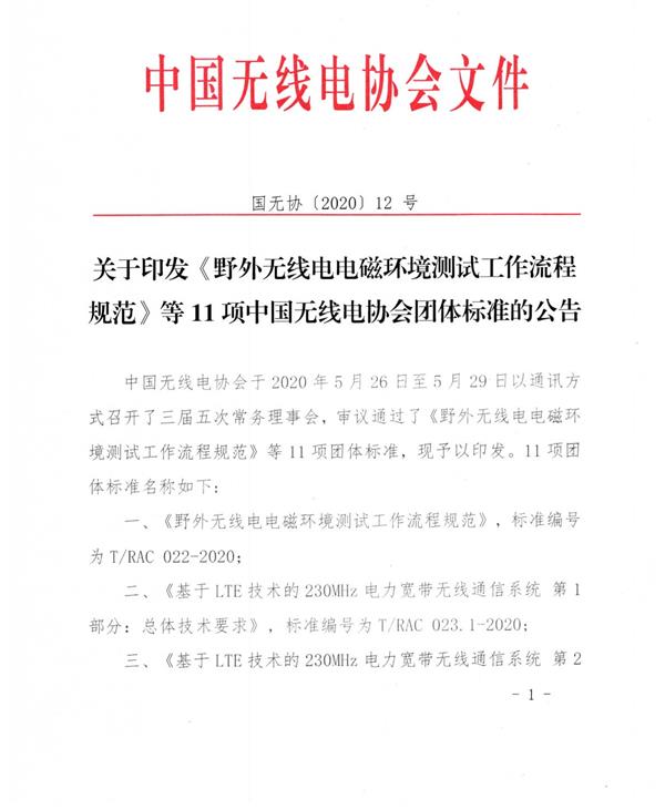 關于印發《野外無線電電磁環境測試工作流程規范》等11項中國無線電協會團體標準的公告