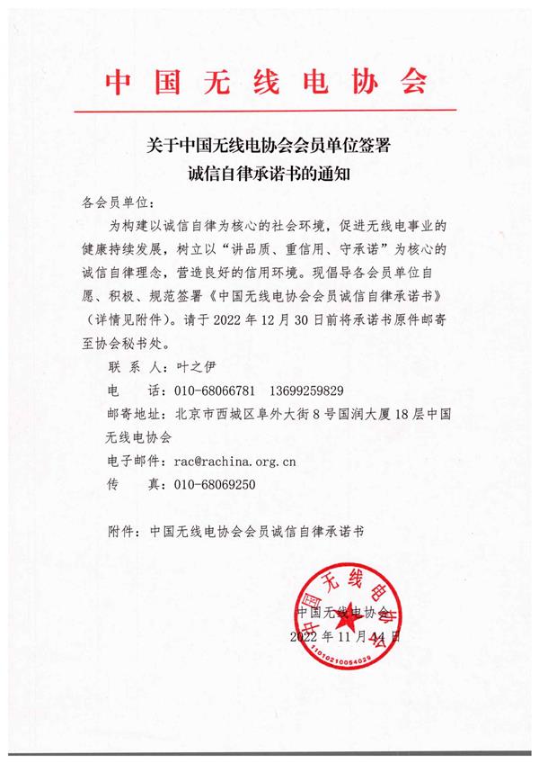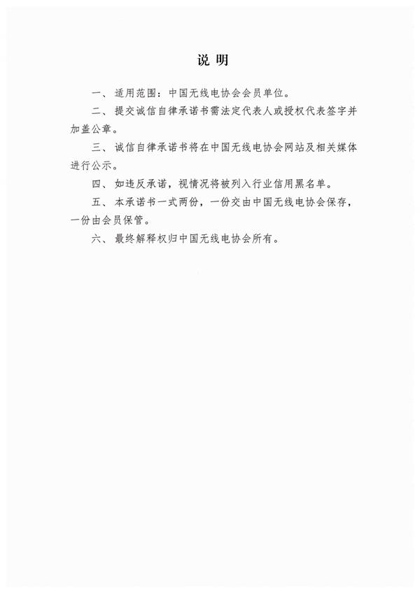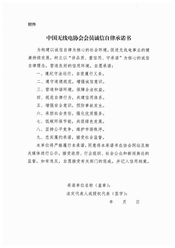 關于中國無線電協會會員單位簽署誠信自律承諾書的通知