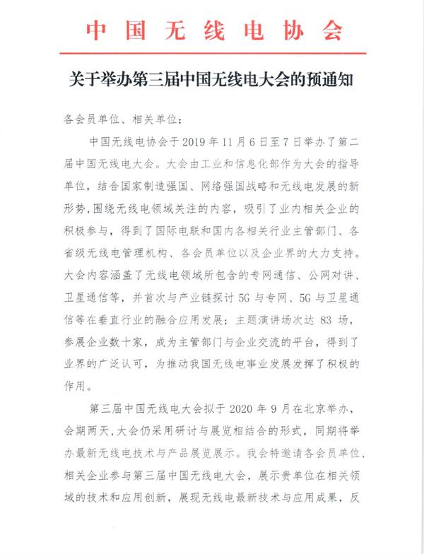 關于舉辦第三屆中國無線電大會的預通知
