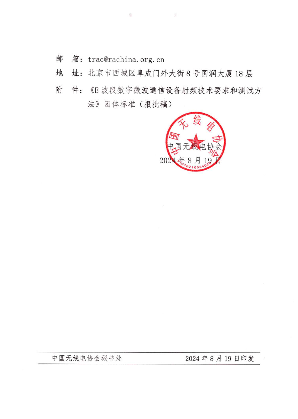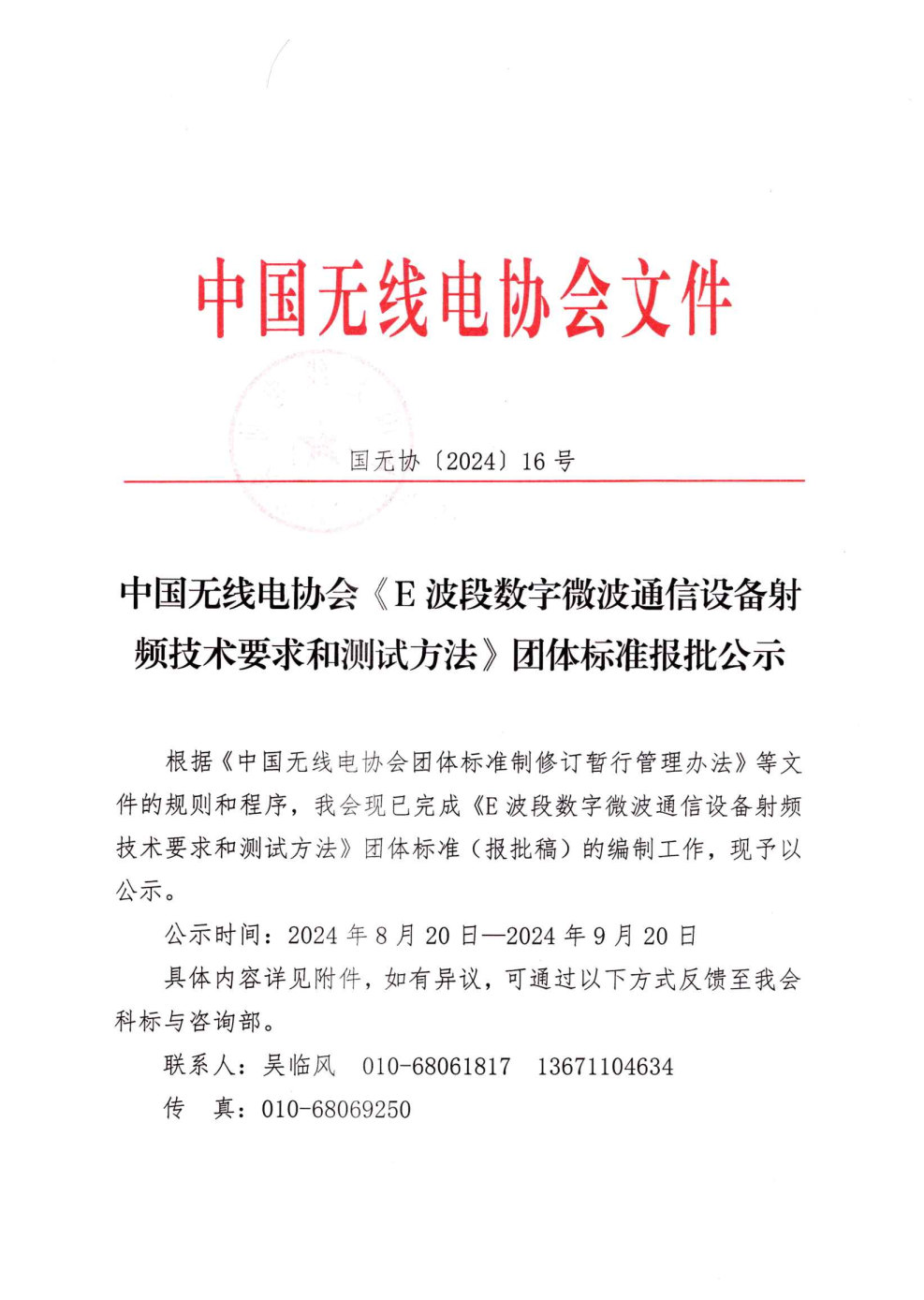 中國無線電協會《E波段數字微波通信設備射頻技術要求和測試方法》團體標準報批公示